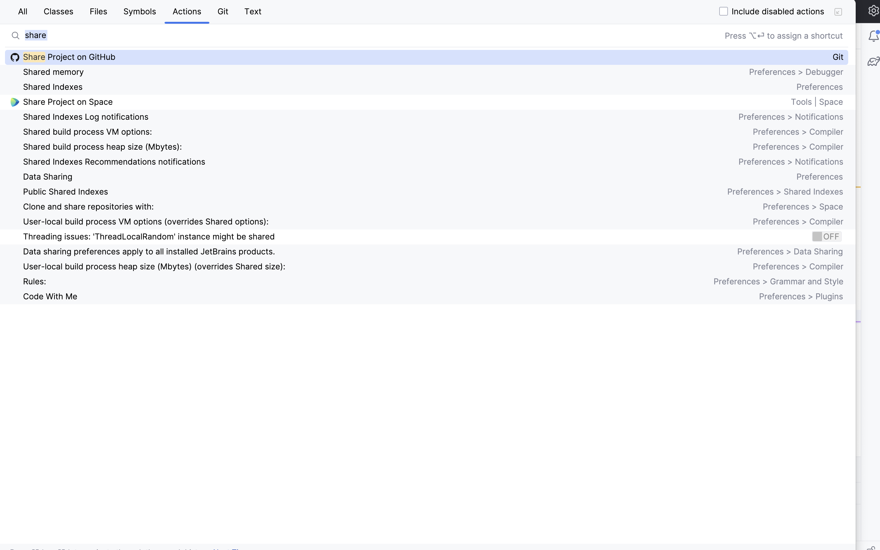 1. 인텔리제이에서 command+shift+A 단축키를 이용하여 전체 검색 창을 연다.
