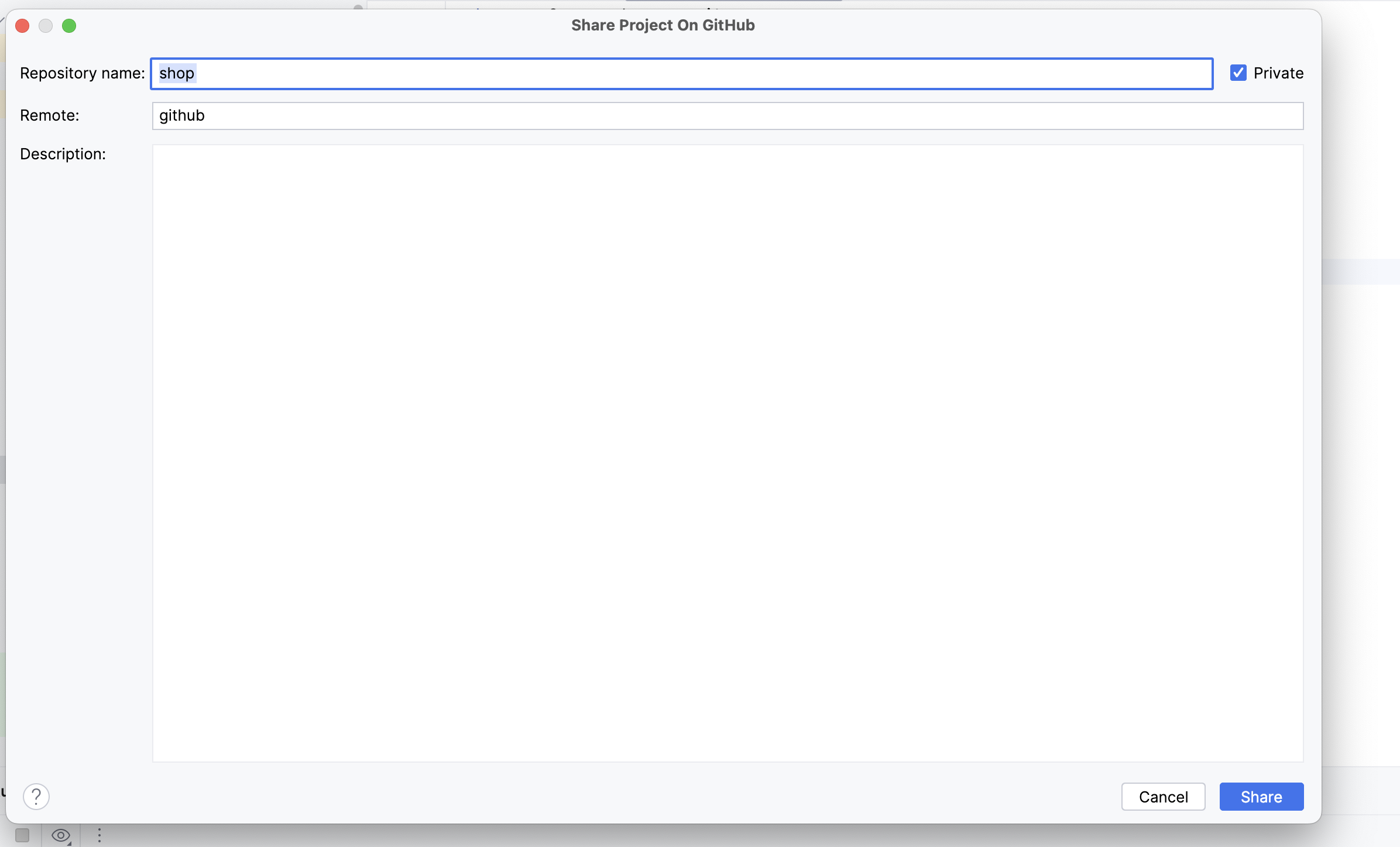3. 로그인 후 repository name 필드에 저장소명을 입력한 후 share 버튼을 누르면 깃허브에 저장소가 생성된다.