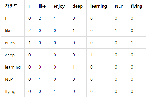 co-occurence matrix : 같은 문장에 한 단어가 어떤 근처들과 몇 번 이상 나오는지