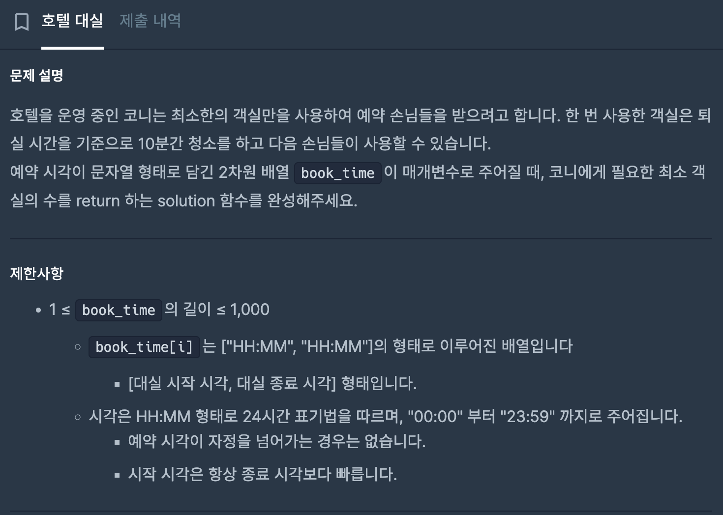 먼저 book_time 배열의 시간,분 값을 분단위로 합친후 대실시작시간을 기준으로 정렬한다.